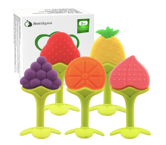 Teethers I like a couple of different teethers. These silicone fruit teethers are a must-have because they’re dense and give your baby different ways to chew. The long, stick-shaped teethers are also great because they are easy for babies to grasp and long enough for them to chew on their back gums. This skill of chewing is important to practice both before and during the introduction of solids. As a bonus, you can even squeeze some purée in the middle of a stick-shaped teether, freeze it, and give it to your baby for a tasty treat!