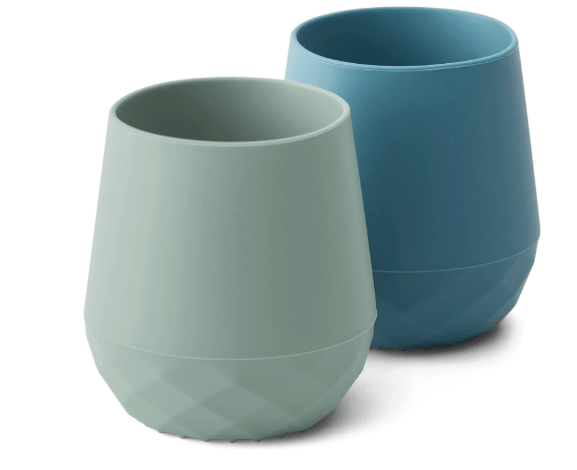 Open Cup (their first open cup) This is my favorite first open cup. Around 6 months, you can introduce open cup drinking, and this one is perfect. It’s made of soft silicone, so it’s okay for baby to bite, and it’s weighted at the bottom to help with stability and support your baby as they learn to hold it.